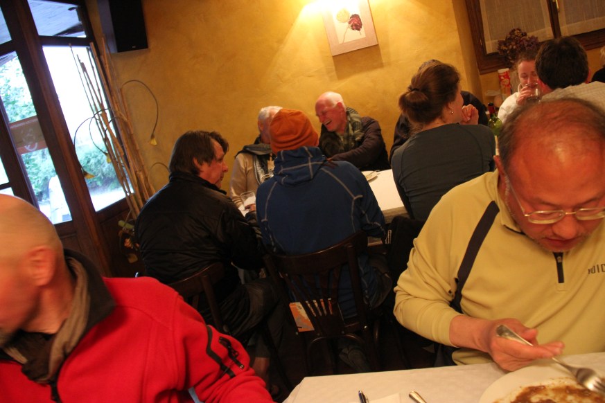 Jo 800 km taittanut ranskalainen Spock puoliksi kuvassa, takana britit isä+poika: poika selin meihin ja isä nauraa, sekä mukava Thjong
