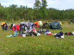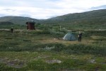 Yöllä tuli Snelmanninmajalle 4 tai viisi kalastajaa veneiden kanssa. Yksi uskalsi tulla meidän kanssa tupaan yöksi, muut telttailivat. Me lähdemme hissukseen, mutta ei hiljaa (aina kun yrittää olla hiljaa, ettei herätä jotakuta muuta, niin tuntuu, että aiheuttaa normaalia enemmän melua…) matkaan klo. 11.15 taas hyvässä kelissä. Kahden kilsan päässä on kolttakylä, jota ihmetellään. Aittajärven ylityspaikalla kohtaamme saman kolmen naisen porukan, jotka tapasimme menomatkalla Sarviojalla. Kerromme heille, että tavattiin jonkun heistä pikkuveli vaimonsa kanssa tällä reissulla! Maailma on vaan pieni! Vaihdetaan kuulumiset ja heidän taksi on tulossa klo. 14.00 ja meillähän noutoaika on klo. 15.00.
