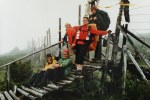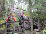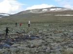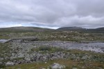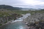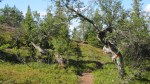 Kasaamme leirin ja teemme samoin. Alhaalla joen ylitykseen on apuna kolme kapeahkoa puunrunkoa ja alla kapea, mutta vuolaasti virtaava joki. No hemmetti! Olen niin tasapainoton ja kömpelö ihminen, että tipun takuulla jonkkaan, enkä tahdo tallata rinkkaa myöten märkänä! Ari ylittää puita pitkin joen hienosti ja uskaltaa naureskella, kun riisun bootsit ja pitkät pöksyt pois ja nautin reisiä myöten aamuhuljutuksesta kirkkaassa joessa eli kahlaan yli. Jatkamme kuivina matkaa, paitsi hikeä pukkaa, sillä sää on turhankin helteinen. Harhaudumme polulta hieman ja rämmimme ja pompimme suon yli. Öinen sade teki polut aika vetisiksi. Poroaidalla vastaan tulee yli kymmenen partiolaisen ryhmä. Reitti muuttuu kuivemmaksi kääntyessään metsään. Nämä metsät ovatkin outoja. Hienoja, oikeita metsiä. Kelojakaan ei olla nähty koskaan näin paljoa! Jyrkkävaaran tuvalle taiteilemme vetteikön yli puunrunkoja pitkin.