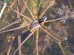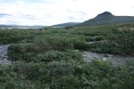 Yöllä satoi taas reippaasti, jotta pääsemme jatkamaan matkaa hyvässä kelissä klo.11.15. Todella paskanmärkä suuntima joelle saakka ja molemmat kenkäni haukkasi kunnolla vettä, joten jalat litisevät tämän päivän vesihieronnassa. Kasvillisuus on melko korkeaa ja koska muita kulkijoita ei ole ollut ravistelemassa sateen jättämiä vesiä pois, niin ollaan pian litimärkiä reisiin saakka. Onneksi sää on lämmin ja pian reitti muuttuu kuivemmaksi ja jokimaisemat ilahduttavat kulkijoita! Mietimme ensin ylitystä jo Lotjanankankaan kohdalta, mutta epäröimme, koska vettä on nyt niin paljon niin Snelmanninmajan kohdalla ylitys voi olla mahdottomuus. Jatkamme matkaa kohti kartan ylityskohtaa, josta pääsemme samalle puolelle kuin seuraavan yön majapaikka.