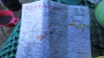 Elokuu alkoi. Heräämme hyvin nukutun yön jälkeen. Ei edes hyttysen ininää korvissa! Pakkaamme kamat hissukseen, juomme kahvit, teet ja syömme aamupuurot. Jyrkkävaaran suunnasta tulee isä lapsineen (ehkä 14 vuotias tytär ja 12 vuotias poika). Reippaan ja hyväntuulisen oloista porukkaa. Reittiä miettivät ja hetki juteltiin, niin tuntuivat päätyvän alkuperäiseen suunnitelmaansa eli taisi olla sama kuin meillä, mutta vastapäivään. Mies kehui karttaani ja sen helppoa luettavuutta -otan aina kopion kartasta oman reitin osuudesta. Yliviivauskynällä piirrän noin-suunnilleen reitin ja kirjoitan itselleni tarpeelliset merkinnät karttaan ja kontaktoin sen lopuksi. Kestää riittävästi sadetta ja taipuu hyvin rinkan sivutaskuun. Mies otti muutaman valokuvan kartastani ja rientävät reippaasti matkaan.