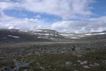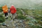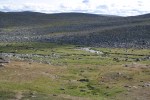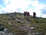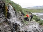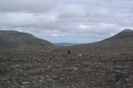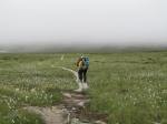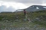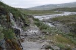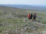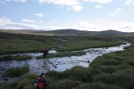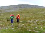Nuoria ei innostanut jäädä enää erämaahan, joten tiemme eroavat. Teimme vielä runsaan päiväruoan ja sitten Arin kanssa kahlasimme klo.14.00 joen yli matkaan kohti kauneudestaan kehuttua Paratiisikurua. Sää on taas hyvä ja reitti kaunis. Saavumme Paratiisikuruun ja ei sitä turhaan olla kehuttu. Kyllä luonnon kauneus on hämmästyttävää. Hämmästely vaihtuu muutamaan naurahtelevaan huokailuun, kun näemme laakson toisen puolen rinteessä jyrkkää mäkeä kulkemassa Sarviojalla tapaamamme miehen Tyyne-koiransa kanssa. Tunnistamme heidät kaukaa Tyynen punaisista valjaista. Kurussa on meidän lisäksi kaksi pariskuntaa, toinen putouksella, toinen taukoilemassa. Me kuvaamme ja jatkamme matkaa rinnettä ylös pikkuhiljaa puuskuttaen. Ylhäällä Ukselmapäällä pilvet tulevat päälle ja näkyvyys on yht´äkkiä vain muutamia metrejä! Vaihdan hikisen paidan kuivaan, koska auringon kadotessa käykin kylmä viima.