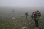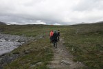 Päätämme kiertää Pirunportin, koska ei siellä mitään näkisi eli Ukselmapäällä kaarretaan hieman oikeaan ja sitten olisi osuttava alas laaksoon joko Lumikurun polulle tai Pirunportilta tulevalle polulle. Ukselmapäällä polku loppuu joten nyt on itse löydettävä reitti eteenpäin. Takanamme tuleva Iisalmelainen nuori pariskunta oli menossa Pirunportin kautta, mutta kun kerroin reittisuunnitelmamme, niin he päätyvät samaan näkyvyyden takia. Luultavimmin kävelimme hieman siksakkia Ukselmapäällä -itselläni oli suunta hetken aivan kateissa, mutta toisilla oli Suunnon ranne gps, Arilla Garminin gps ja mulla kartta ja vahva usko suuntaan (oli mulla kompassi mukana, mutten viitsinyt vielä sitä kaivaa esille). Täytyyhän meidän nyt tekniikkaan luottaa! Lopulta olemme kaikki yhtä mieltä suunnasta ja ennen laskeutumista laaksoon vielä tarkastamme, että suunta on kaikkien mielestä oikea. Alhaalla kuuluu veden lorina. Lupaavaa. Hetken päästä näen jotakin, jonka toivoin olevan polku ja sepä se! Kaikki hyvin. Joen vartta pitkin kolmisen kilsaa hyttysten ympäröimänä ja saavuimme siinä ilta yhdeksältä Muorravaarakanruoktulle. Mökin puolelle oli vielä ”bootsit pois -kahlaus” ja sitten se oli siinä. Autiotuvassa oli vain kaksi mimmiä (”Allut” Tampereen suunnasta-voi olla, että muistan väärin lempparinimet, mutta ehkäpä näin 🙂 ), jotka olivat Sarviojallakin, joten päätimme majoittua sinne. Tyyne-koirakin oli päässyt hyvin perille omistajansa kanssa.