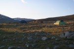 Joen ylitys oli mallikas. Hylättyjä ylityskenkiä oli runsaasti tarjolla ja osa porukastamme niitä lainasikin. Kaikki tykkäsi ylityksestä, vaikka virtausta nyt mennessä oli ensikertalaisillekin kivasti. Jatkoimme helteisessä säässä metsäisessä maisemassa. Höttösiä on riittävästi. Emme oikein osanneet nousta tunturille, joten tallasimme tallattua reittiä pitkin. Ari väsyi vauhtiin, sillä 19-vuotias Iitu ja 25-vuotias kummipoikani Miro noppajalkoineen ja pikkurepuilla pitivät kovaa vauhtia yllä. Mulla rinkka painoi lentokentällä 17 kg ja Arilla 19,5 kg, joten saimme tuon tuosta toppuutella vauhdin pitäjiä. Ennen nousua alkoi sataa. Kiskoimme sadeviitat päälle ja tallasimme ohi Sudenpesän kammin, jossa oli porukkaa ja saavuimme Sarviojalle klo.21.00. Meillä oli varauskämpän puolella majoitus. Siellä oli kolme naista entuudestaan. Tulleet samalla lennolla kuin me, mutta lähteneet heti kentältä matkaan ja siksi ehtineet olla jo jonkun aikaa perillä ja tohottaa iltatouhut. Kämppä oli melkoisen ahdas, joten hyvä että touhuiltiin eri rytmissä.